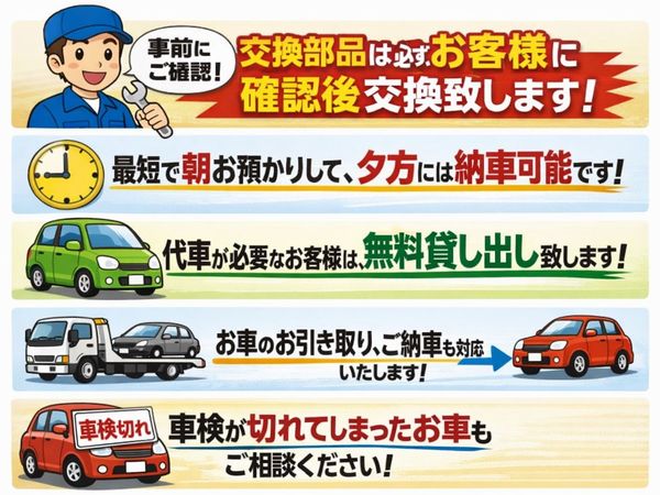 ※上記は、部品交換などが発生しないお車の場合ですので、整備や部品交換が必要な場合は別途費用がかかりますのでご了承ください。